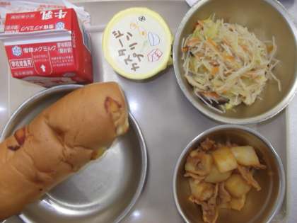 今日の給食の献立は「チーズコッペパン」「豚肉のケチャップ煮」「たっぷり野菜のビーフン」「牛乳」です。