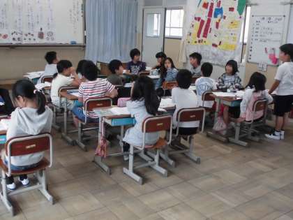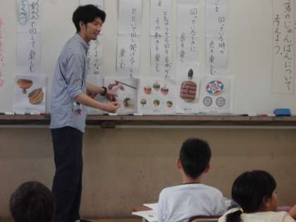 3年生の説明文「こまを楽しむ」では、「色変わりご」「鳴りごま」「さか立ちごま」「たたきごま」「曲ごま」「ずぐり」の順番でこまの説明が書かれています。今日の学習は、なぜ筆者の安藤さんはこの順でこまを説明しているのか。西村先生の「どんなふうにこまを回すかやってごらん」という問いかけかけから,「簡単に回せそうなこまから徐々に回すことが難しい順に書いてある。」と筆者の説明のしかたを読み取ることができました。