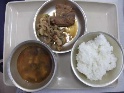 今日の給食の献立は,「ごはん」「みそ汁」「万願寺とうがらしおかか煮」「さばの梅煮」です。