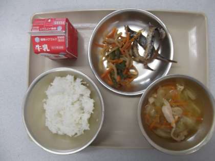 今日の給食の献立は,「ごはん」「キャベツのすましじる」「野菜のきんぴら」「ししゃものから揚げ」「牛乳」です。