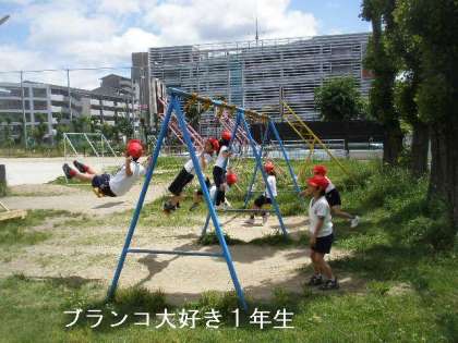 休み時間になると,一目散にブランコに向かって走り出します。1年生は,ブランコ派と総合遊具派に分かれていますが,ブランコの数が少ないのでいつもチャイムがなると競争です。でも,仲良く交代して遊んでいます。