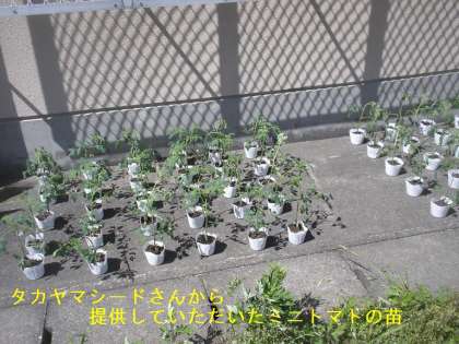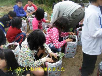 事前の授業後,畑の移動して実際に苗植えを教えてもらいました。そして,一人一袋「ミニトマト」を植えました。