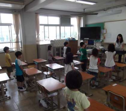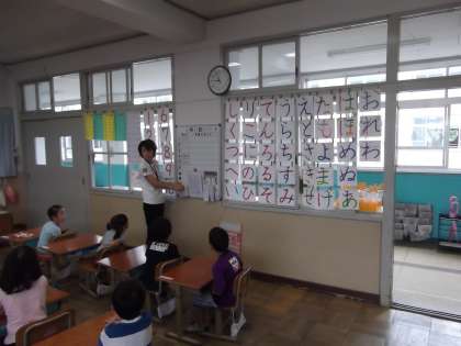 1年生の朝の会で,今日の予定や校歌等の歌の練習をしていました。
