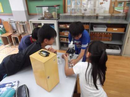 理科の時間に顕微鏡の使い方について学習しています。今日は,一人一人が顕微鏡を使いめしべ,おしべなどをみていました。