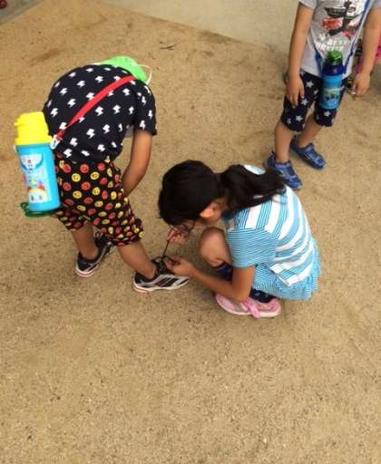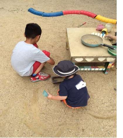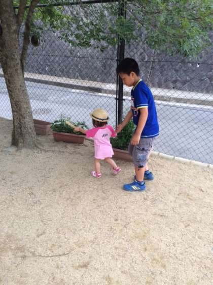 お外で遊んでいます!園児と一緒に砂遊び!靴ひもが…そんな時は優しく手助け。