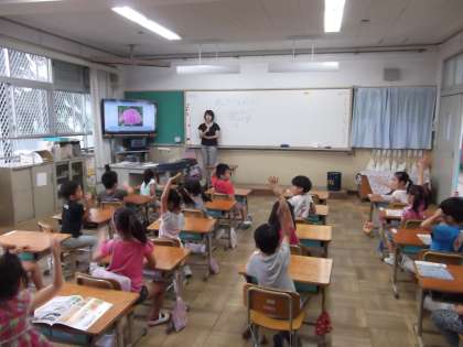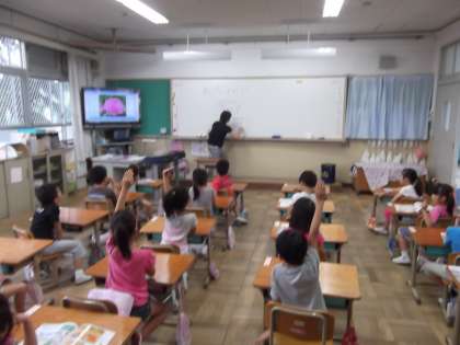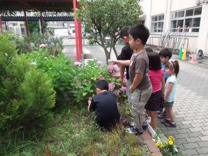1年1組は,図化工作の時間に「あじさい」を描こうとしていました。あじさいを描くためにあじさいの観察に出かけました。