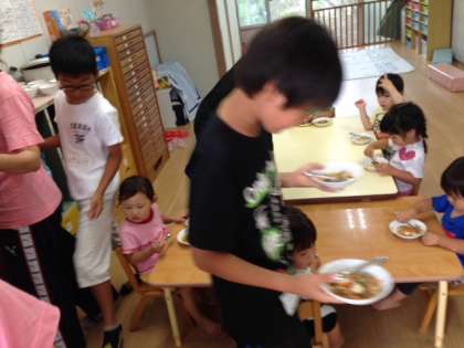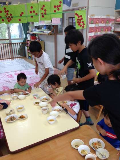 園児たちは,今から給食てす。5年生は,給食のお手伝いをしています。さすが5年生給食の準備も慣れた手つきで行っていました。
