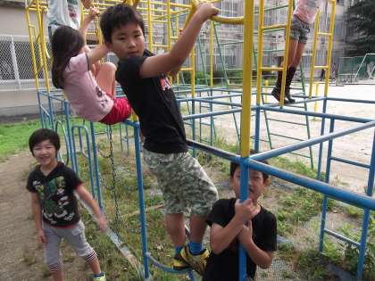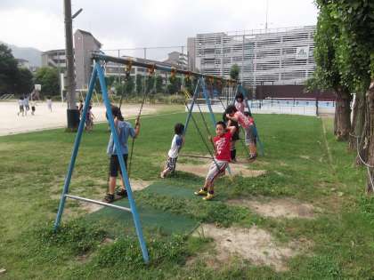 さわやかな朝です。子ども達は,朝休み元気に運動場や総合遊具,ブランコで遊んでいます。