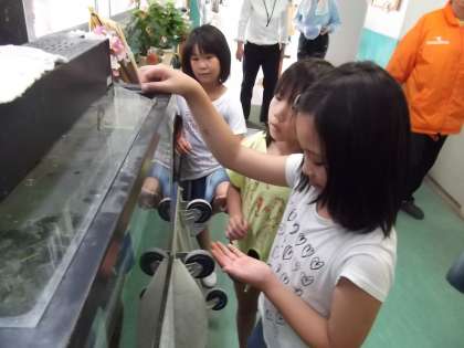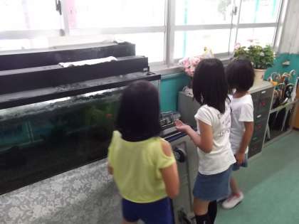 金魚が,水槽から餌をほしそうな顔をしていたので3年生が餌を与えてくれました。金魚は,大満足です。