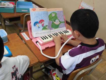 1年生は,音楽の授業で鍵盤ハーモニカの練習を始めました。授業がはじまってしばらくすると,学校に郵便屋さんが大きな封筒を持って来ました!宛名は「だいごにし しょうがっこう 1ねんせいのみんなへ」差出人はけんばんはーもにかかくん。1ねんせいの子ども達は,届いた封筒に興味津々。「何が入っているの?」「お手紙読んで。」と待ちきれない様子。お手紙には,上手に楽しく鍵盤ハーモニカを演奏する時に気を付けてほしいことが書いてありました。器楽の学習の始まりの勉強です。大切なことを1つ1つ確認しながら,楽しく学習を進めてほしいものです。