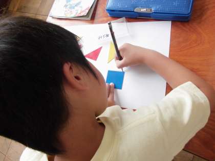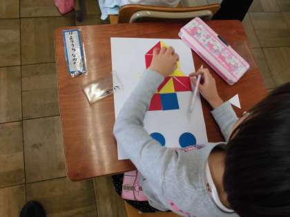今日の算数の学習は,三角形,四角形や円を使っていろいろな絵をかく学習です。子ども達は,それぞれの図形の特徴を生かしながら,思い思いの絵をかくことができました。「どうしてこの形をつかったの?」と尋ねると「だって,三角形の角が炎みたいだから。」「ここは先っぽだから,四角じゃなくて三角した。」など形の特徴を上手く生かして楽しく絵をかくことができました。