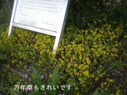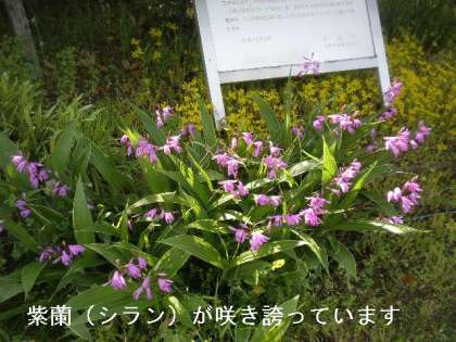 紫蘭(シラン),万年草が一番見ごろです。紫と黄色がうまく緑にマッチしてきれいです。ところどころにオレンジのケシ科の花も咲いています。