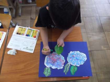 図画工作の時間に「よくみてかこう」を学習しています。今日は,あじさいを描いていました。あじさいを細かい部分までよく観察していました。
