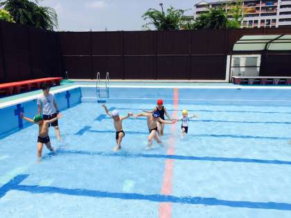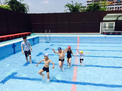 お天気に恵まれ,広いプールで楽しんでいます。
