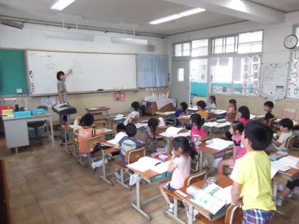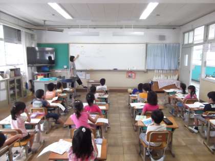 算数の時間に「たしざん」を学習しています。今日は,絵を見て「合わせて何個」の文章を作っていました。