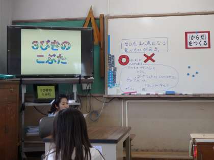 「3びきのこぶた」の話を聞いて、それぞれの栄養をバランスよく食べることの大切さを知りました。