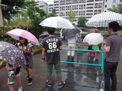 雨の中の朝の挨拶運動