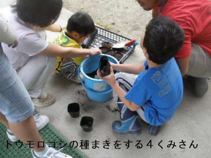 4くみの子どもたちも,今日トウモロコシの種まきをしました。「ポップコーン」用のトウモロコシを育てて,収穫したらみんなでポップコーンパーティーをするそうです。楽しみですね。