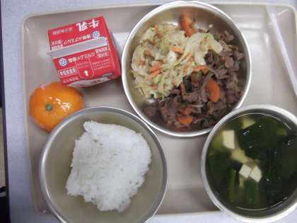 今日の給食の献立は,「ご飯」「すまし汁」「キャベツのごまに」「牛肉の時雨煮」「みかん」「牛乳」です。