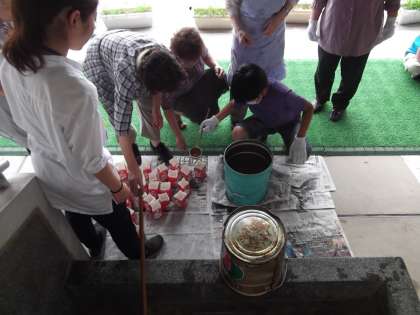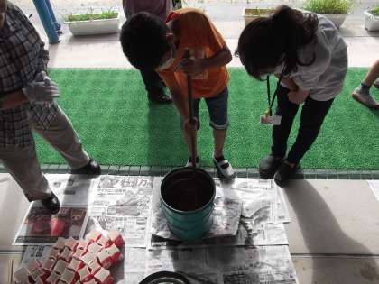 石鹸のもとを30分かき混ぜました。その液体を,牛乳パックに詰めて1週間乾燥させて出来上がりです。出来上がりが,楽しみですね。