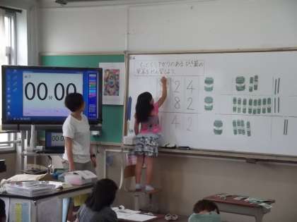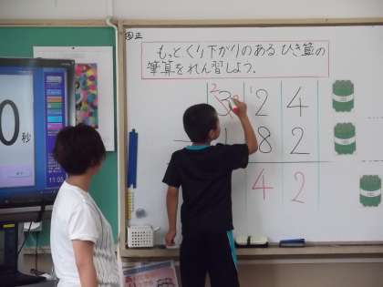 3年1組では,算数の時間に「ひき算」を学習しています。今日は,ひき算の筆算の練習問題をしていました。