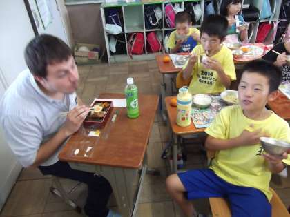 今日は,ALTのマシュー先生と一緒に給食を食べました。子ども達は,マシュー先生に出身地や家族などについて質問していました。