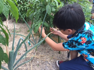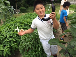 畑でみのりに実った、なすと万願寺とうがらしを収穫しました。