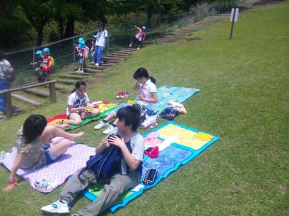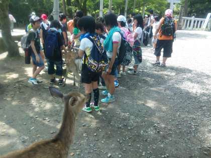 若草山のお弁当! 子どもたちは高いところがすきなようです。短時間でお弁当をたいらげたあと,鹿とたわむれています。先生に買ってもらったシカセンベイをやっています。