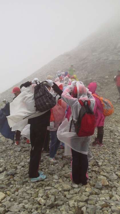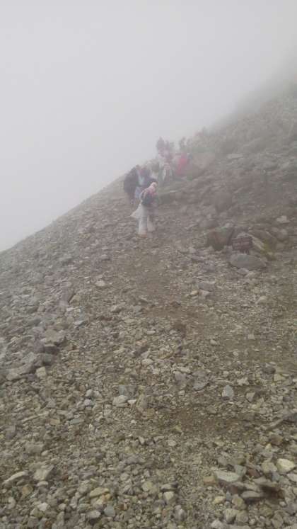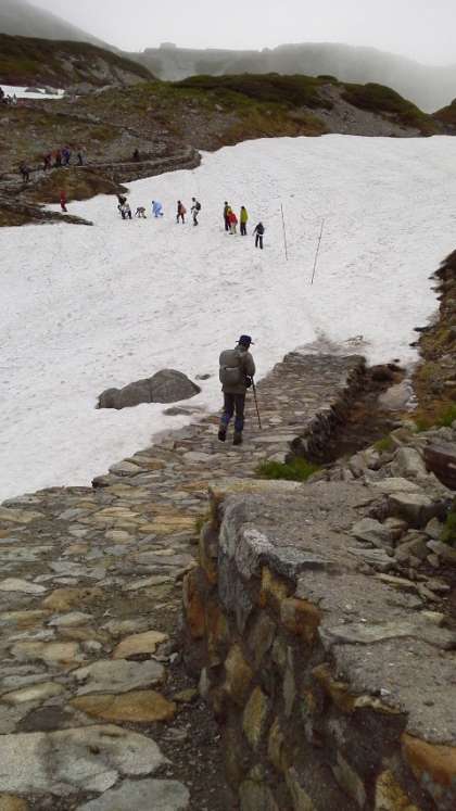 雪の上を歩いたり、雪解け水が流れるところを越えたりしながら一ノ越山荘につきました。ガスがかかっていたので、しばらく待機していたのですが、雄山へ向かうことにしました。全員元気に出発しました。外はとても寒いです