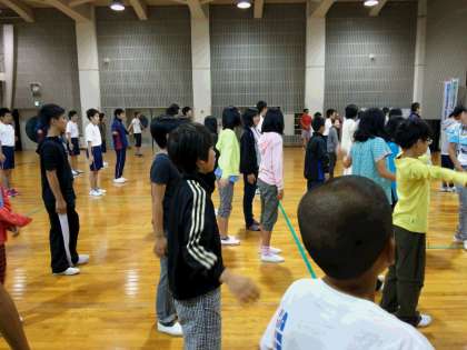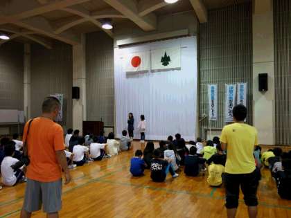朝の集いでのラジオ体操,学校紹介をしている様子です。