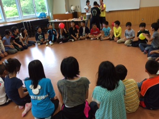 最後のレクです。ふうせん爆弾ゲームをして楽しんでいます。ゲームの内容は,子ども達で考えました。