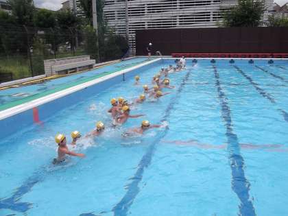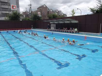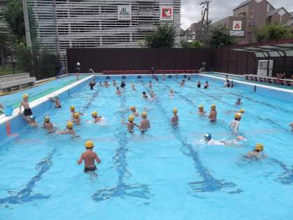 1年生と合同で,水泳学習を行っています。写真は,水なれの様子です。