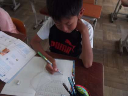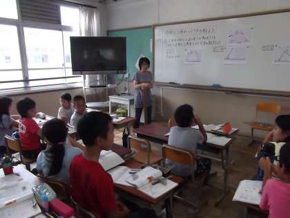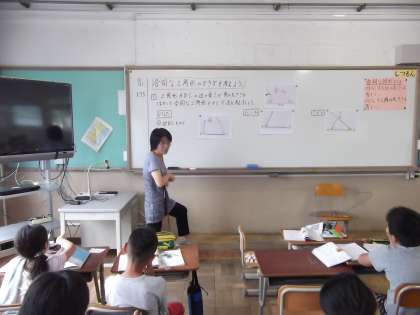 算数の時間に「合同な図形」を学習しています。今日は,合同な三角形の書き方を考えていました。