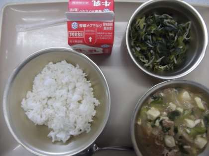 今日の給食の献立は,「麦ごはん」「五目どうふ」「ほうれん草ともやしの炒めナムル」「牛乳」です。