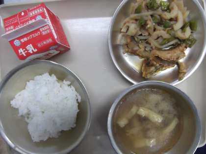 今日の給食の献立は,「ご飯」「もずくのみそ汁」「伏見とうがらしのおかかに」「はたはたのこはくあげ」「牛乳」です。