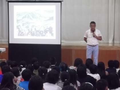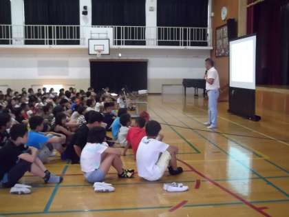 夏休み前最後の朝会の日です。朝会のはじめに校長先生から目標を持って行動する大切さと夏休みのくらしについてお話をしていただきました。