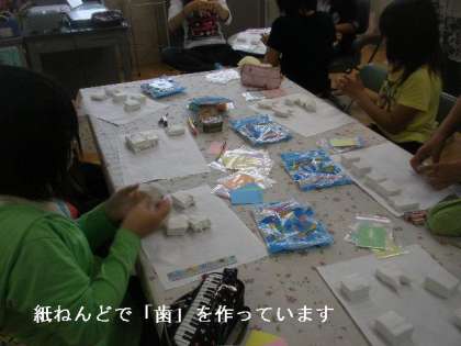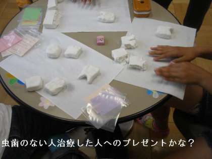 保健委員会では,毎年歯科検診の後,虫歯のない人や治療した人にプレゼントする「真っ白な歯」を紙ねんどで作りました。