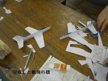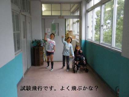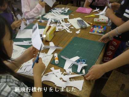 アートクラブです。今日は「紙飛行機作り」に挑戦しました。そして,完成した飛行機をみんなで飛ばしました。