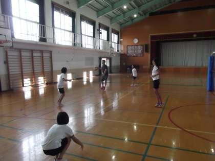 体育館でバレーボール部が練習をしていました。写真は,ボールを使って準備運動をしている様子です。