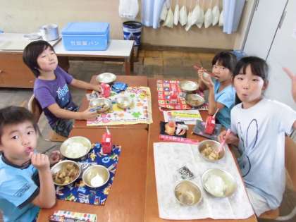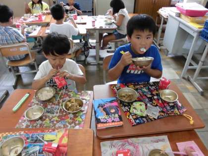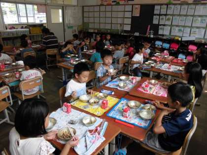みんな仲良く給食を食べています。ごちそうさまでした。