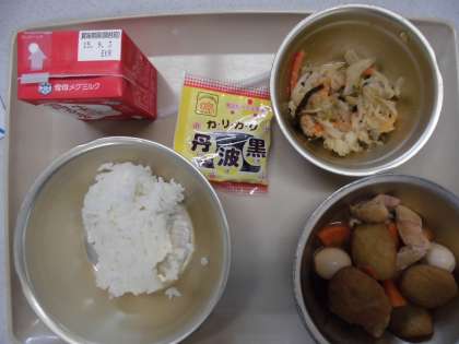 今日の給食の献立は,「ごはん」「平天とこんにゃくの煮つけ」「ごまずに」「黒大豆」「牛乳」です。