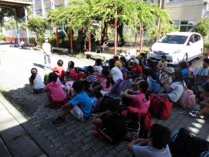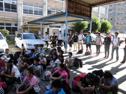 いよいよ長期宿泊学習の出発の日が来ました。ただ今,出発式をしています。出発式では,活動に関しての諸注意等が伝えられていました。