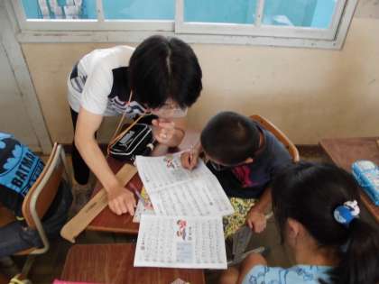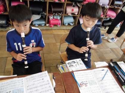 音楽の時間にリコーダーのテストをしていました。課題曲は「喜びの歌」です。緊張しながらテストを受けていました。