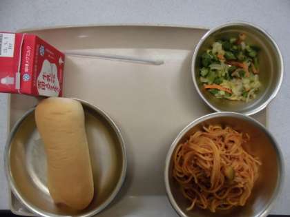 今日の給食の献立は,「こがたコッペパン」「イタリアンスパゲティ」「アスパラガスのソテー」「牛乳」です。
