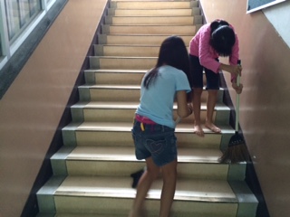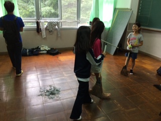 「来た時よりも美しく」を目標に大掃除をしています。この後,昼食を食べて山の家に帰ります。