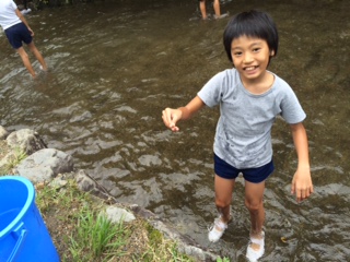 魚つかみ大会が始まりました。 一番最初に魚をつかまえました。