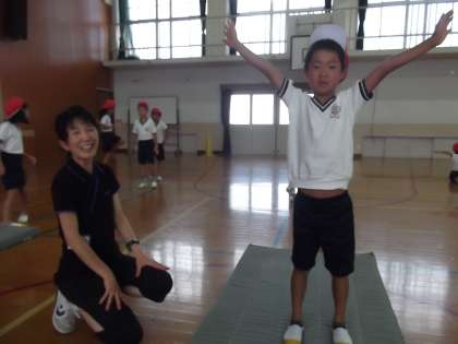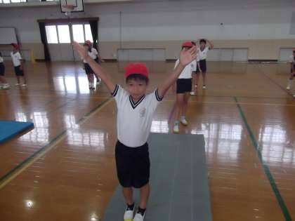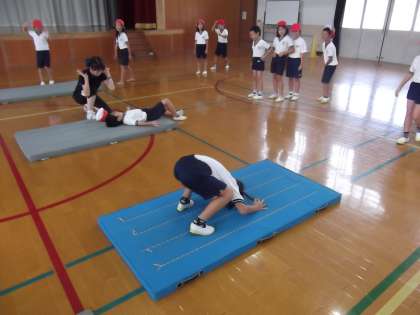 体育の時間に「マット運動」を学習をしていました。今日は,前転と後転の練習をしていました。最後の決めポーズも決まっていました。