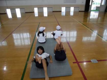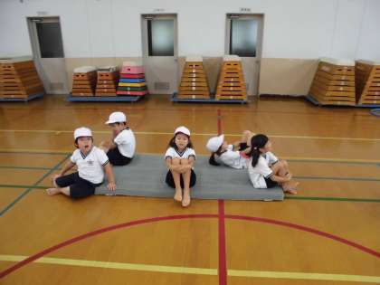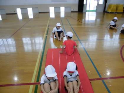 体育の時間に「マットあそび」を学習しています。今日は,「ゆりかご」の練習をしていました。これは,前転,後転の技に結びつく大切な練習です。
