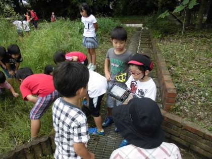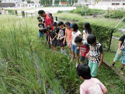 生活科の時間に「めざせ生きものはかせ」を学習しています。今日は,校内のビオトープに生き物探しに出かけました。
