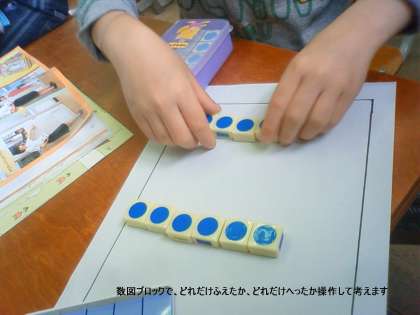 何人おりて、何人減ったか、数図ブロックを動かしながら数の増減を考えます。
